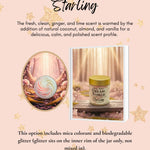 Starling Ingredients: Distilled water, Magnesium chloride, Mango butter, Vegetable Oil, Prunus Amygdalus Dulcis (Sweet Almond) Oil, Chamomilla Recutita (Matricaria) Flower Extract, Lavender extract, Myrrh (Commiphora myrrha), Egyptian blue lotus flower, Cupuacu Butter, chamomile extract, MSM (Methylsulfonylmethane), Boswellia serrata (frankincense), Emulsifying wax, Grassfed beef tallow, Stearic acid, Olive oil, Rosehip seed oil, jojoba oil, Vitamin E (Tocopherol), All-natural fragrance, Optiphen Plus (preservative), mica colorant, biodegradable glitter.