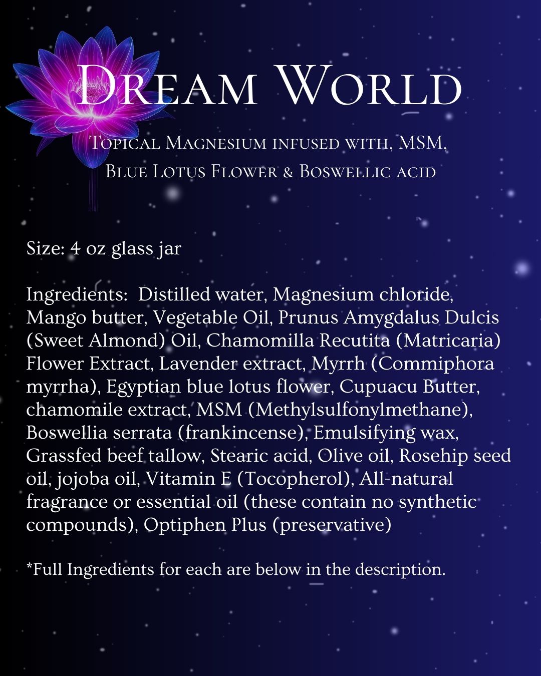 Sweet Dreams Ingredients: Distilled water, Magnesium chloride, Mango butter, Vegetable Oil, Prunus Amygdalus Dulcis (Sweet Almond) Oil, Chamomilla Recutita (Matricaria) Flower Extract, Lavender extract, Myrrh (Commiphora myrrha), Egyptian blue lotus flower, Cupuacu Butter, chamomile extract, MSM (Methylsulfonylmethane), Boswellia serrata (frankincense), Emulsifying wax, Grassfed beef tallow, Stearic acid, Olive oil, Rosehip seed oil, jojoba oil, Vitamin E (Tocopherol), All-natural fragrance, Optiphen Plus (preservative), mica colorant.