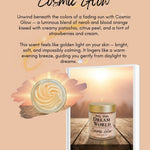 Cosmic glow Ingredients: Distilled water, Magnesium chloride, Mango butter, Vegetable Oil, Prunus Amygdalus Dulcis (Sweet Almond) Oil, Chamomilla Recutita (Matricaria) Flower Extract, Lavender extract, Myrrh (Commiphora myrrha), Egyptian blue lotus flower, Cupuacu Butter, chamomile extract, MSM (Methylsulfonylmethane), Boswellia serrata (frankincense), Emulsifying wax, Grassfed beef tallow, Stearic acid, Olive oil, Rosehip seed oil, jojoba oil, Vitamin E (Tocopherol), All-natural fragrance, blood orange essential oil, Optiphen Plus (preservative) Mica colorant.