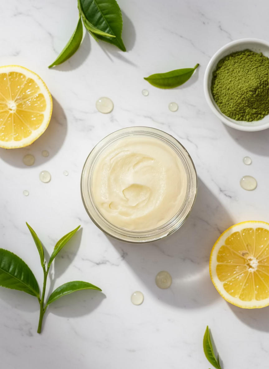 Distilled Water, Prunus Amygdalus Dulcis (Sweet Almond) Oil, Hydrogenated Vegetable Oil, Citrus Limon (Lemon) Peel Oil, Organic Matcha Infused in Avocado Oil, Emulsifying Wax, Jojoba Oil, Hyaluronic Acid, Squalane, Jamaican Black Castor Oil, Bakuchi Oil, Stearic Acid, Methylsulfonylmethane (MSM), Optiphen Plus (Preservative).